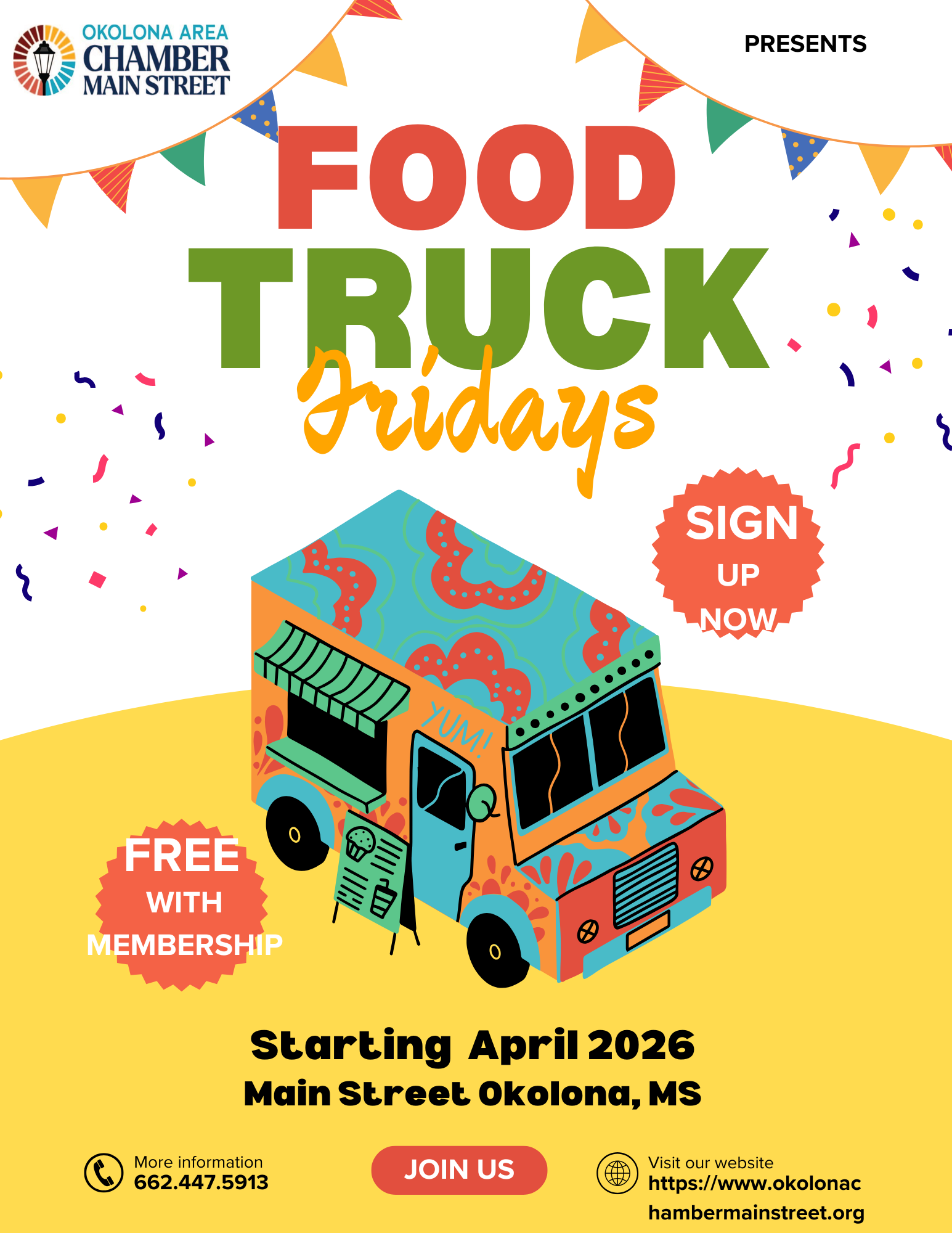 Starting in April 2026, local food trucks will line Main Street, offering delicious eats and a fun atmosphere for the whole community.